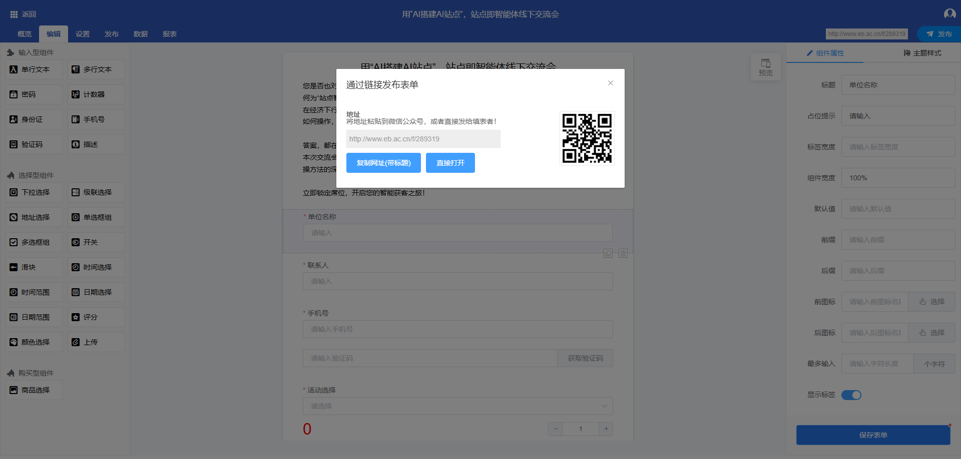 完成表单编辑后,点击 “保存表单”,再点击 “发布” 按钮。发布后可获取表单的二维码和分享链接,用于推广和收集报名缴费信息。