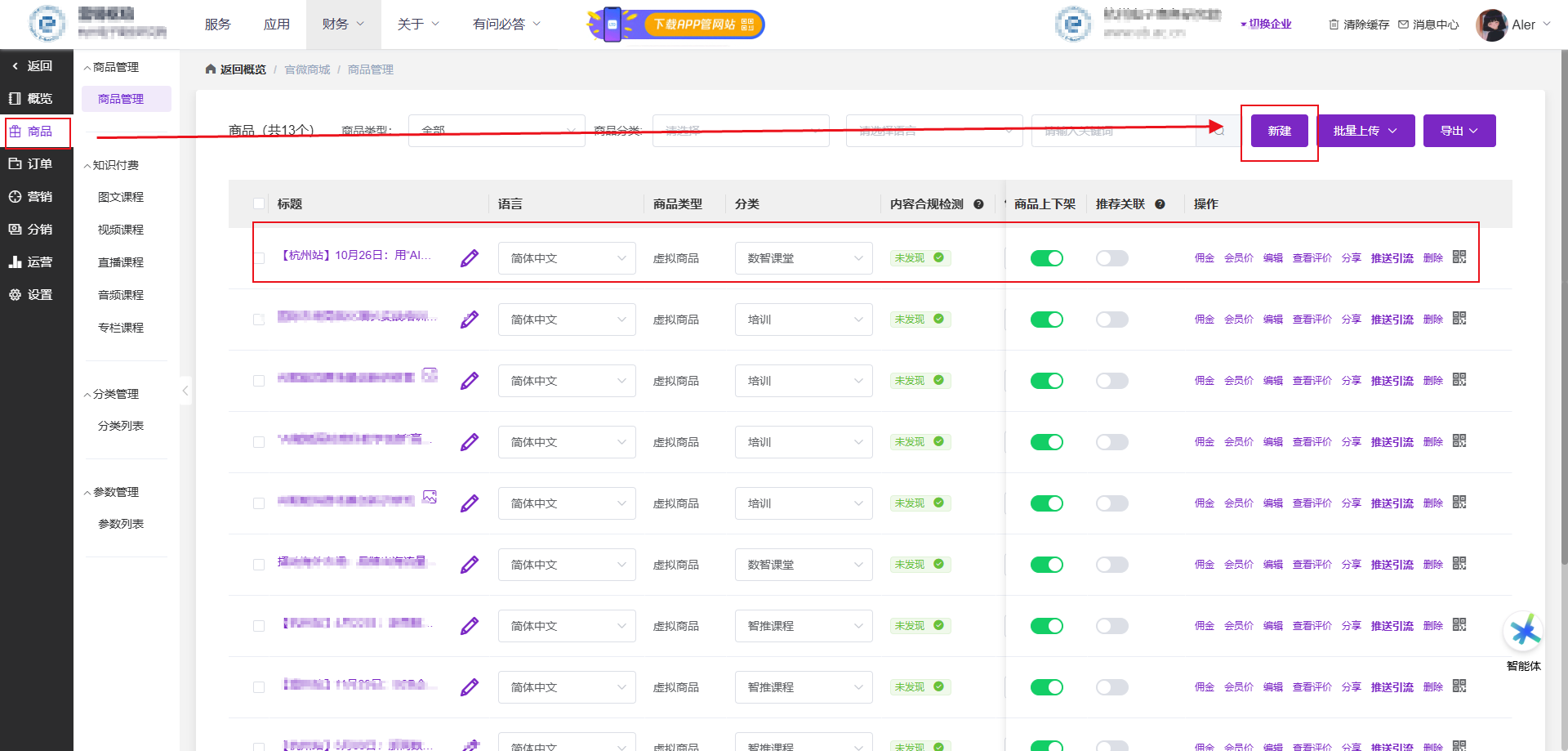 在营销枢纽管理后台,进入商品管理模块,点击 “新建” 按钮,添加付费表单涉及的活动商品(如虚拟商品类的活动报名商品)。