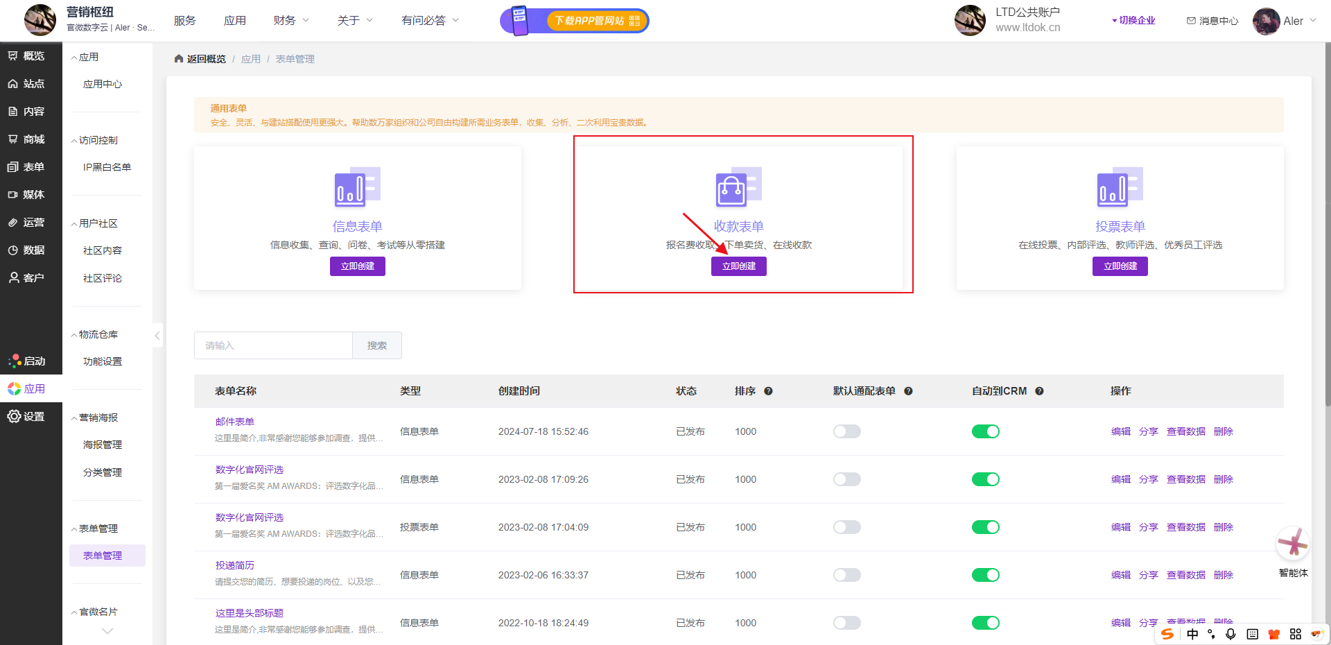 进入表单管理界面,找到 “收款表单” 并点击 “立即创建”,该表单适用于报名收费、下单卖货、在线收款等场景。