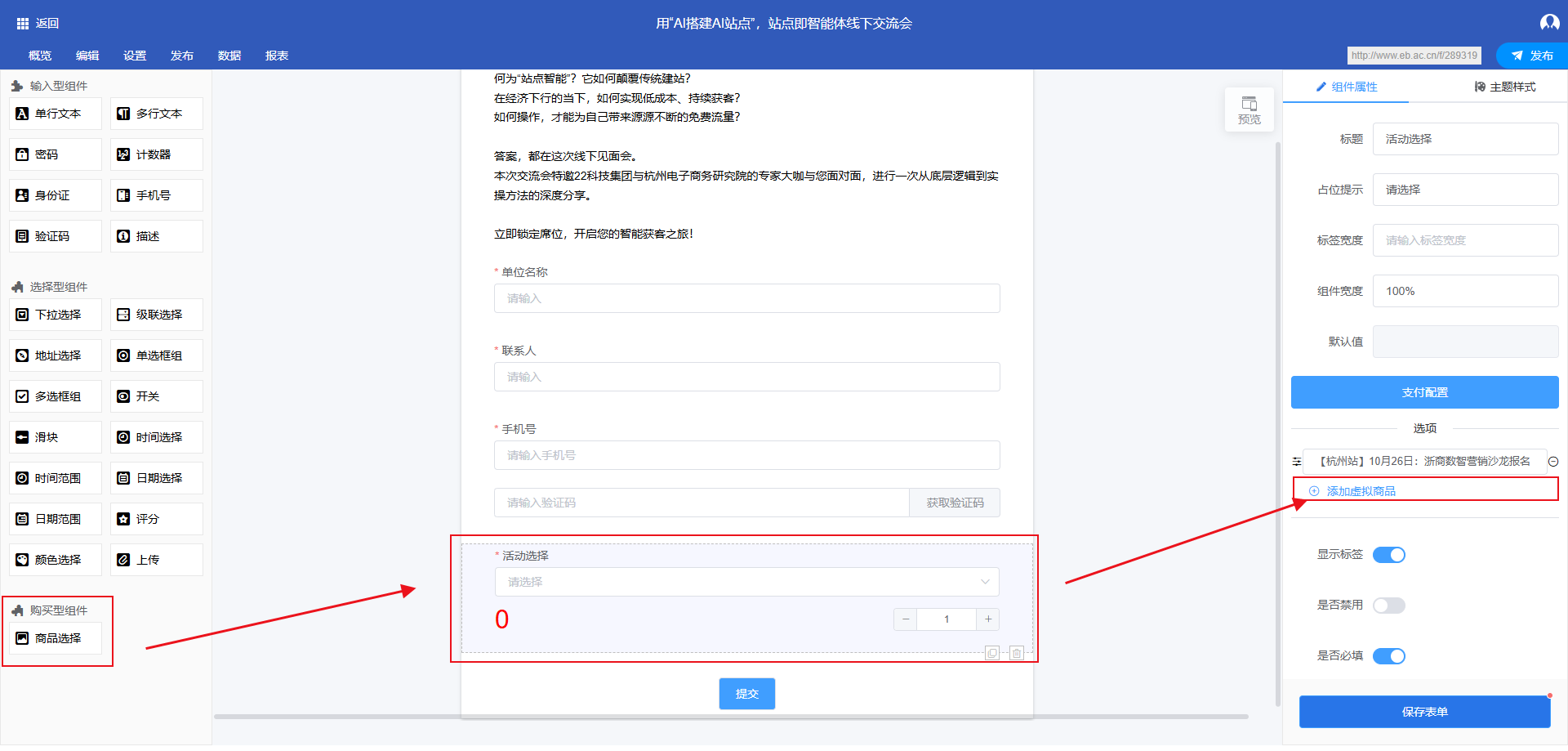 根据活动类型,从左侧组件栏拖拽相应组件至表单编辑面板。若涉及商品购买,需使用购买型组件下的 “商品选择” 组件: