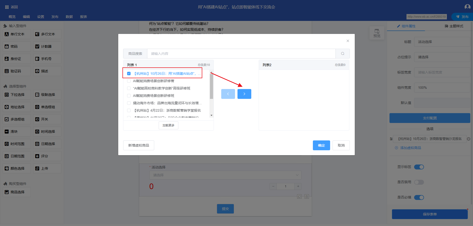 添加虚拟商品:在组件属性栏点击 “添加虚拟商品”,在弹出的商品选择框中,勾选列表 1 中的目标商品,点击右侧箭头将其添加至列表 2,点击 “确定” 完成添加。