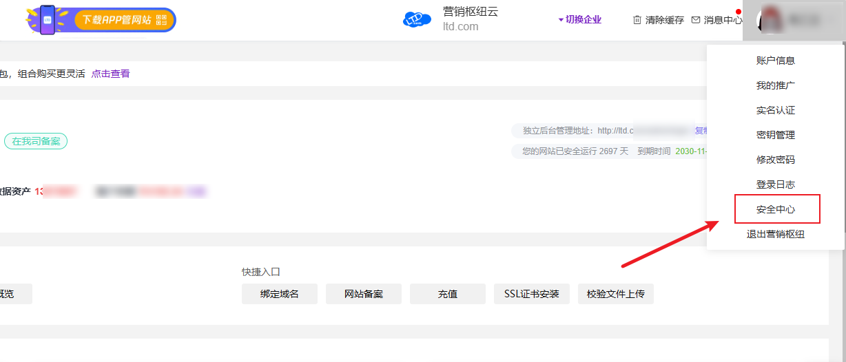 登录营销枢纽后台后,点击右上角的账户下拉菜单,选择【安全中心】进入系统安全维护页面。在左侧导航中点击【技术维护】,即可查看各项维护记录及防护服务状态,包括每周的安全扫描、漏洞检测与防火墙防护。