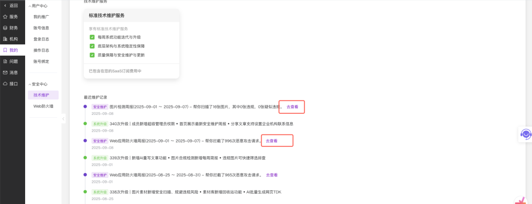 在“最近维护记录”中,系统会按时间顺序展示各类维护周报,如图片检测周报或Web防火墙简报等。每条记录右侧均新增了【去查看】按钮。