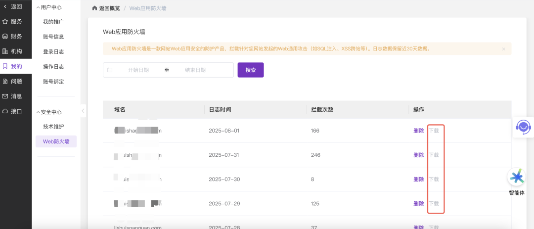 进入【Web防火墙】页面后,可通过时间筛选功能选择所需的日志区间(支持30天内的数据)。在日志列表右侧的“操作”栏中点击【下载】,系统会导出对应时段的安全拦截记录。