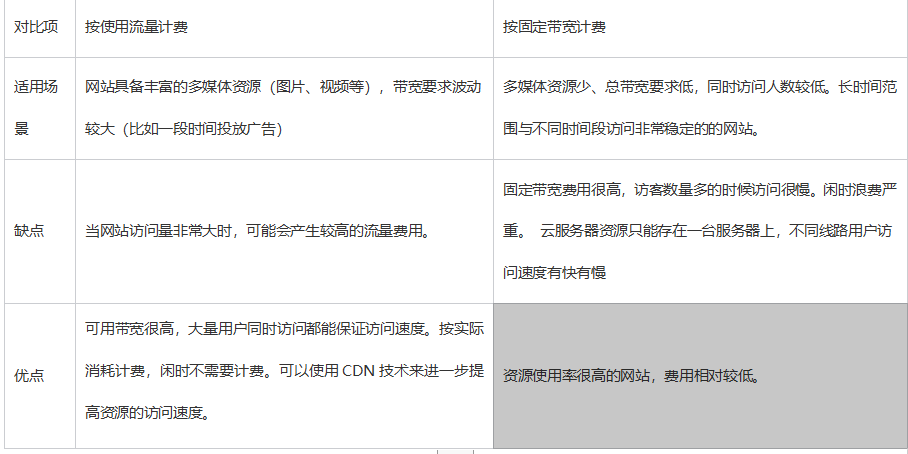 对于大多数云计算服务,通常有按固定带宽计费和按使用流量计费两种计费方式,两种计费方式的对比如下:
