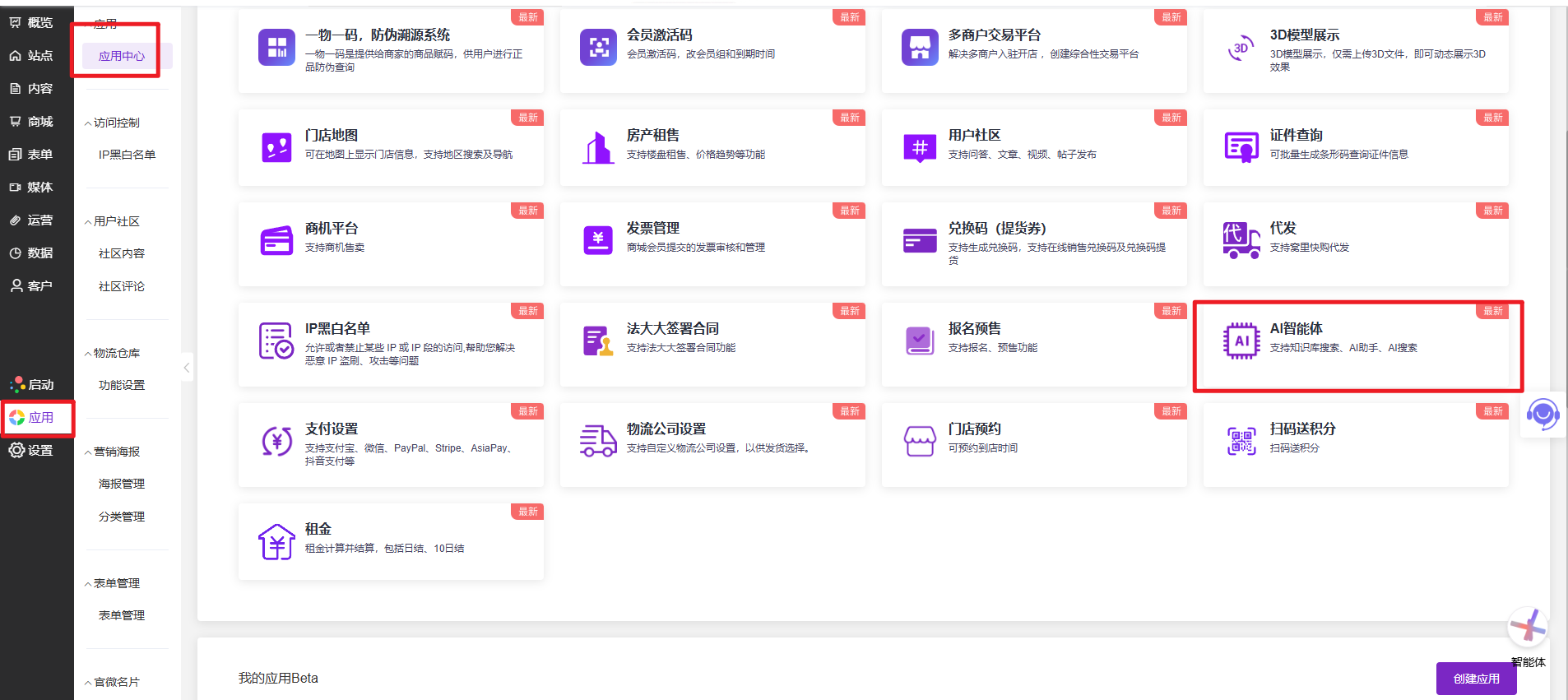 进入官微中心后,点击左侧导航栏的"应用"菜单,找到【AI智能体】,进入AI智能体配置页面。