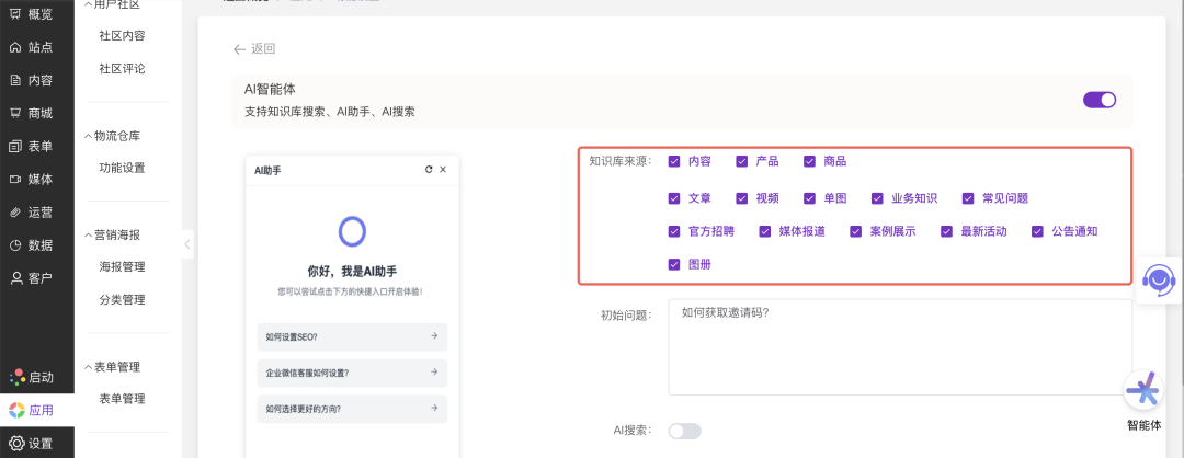 在知识库来源设置区域,您会看到产品、商品、文章、视频、单图、业务知识、常见问题、官方招聘、媒体报道、案例展示、最新活动、公告通知等所有内容类型现已默认为全选状态,确保AI助手能够调用全站内容进行综合分析,无需手动逐一勾选即可实现知识覆盖最大化。