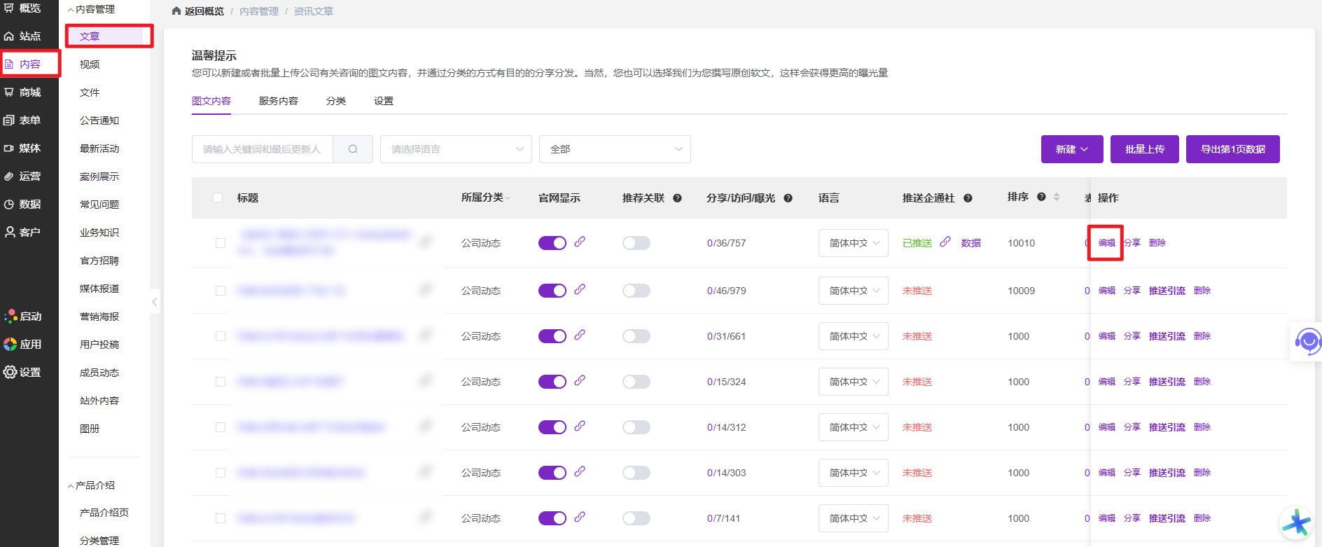 如果您需要生成或优化文章摘要,先通过左侧导航进入"内容"菜单,选择"文章"并点击目标文章进入编辑页面。