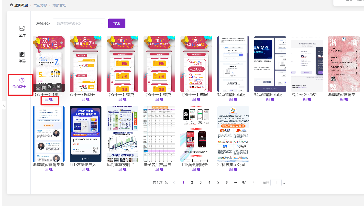 进入营销海报的 “我的设计” 页面,找到需要调整顺序的海报(比如 “早安图” 类海报):