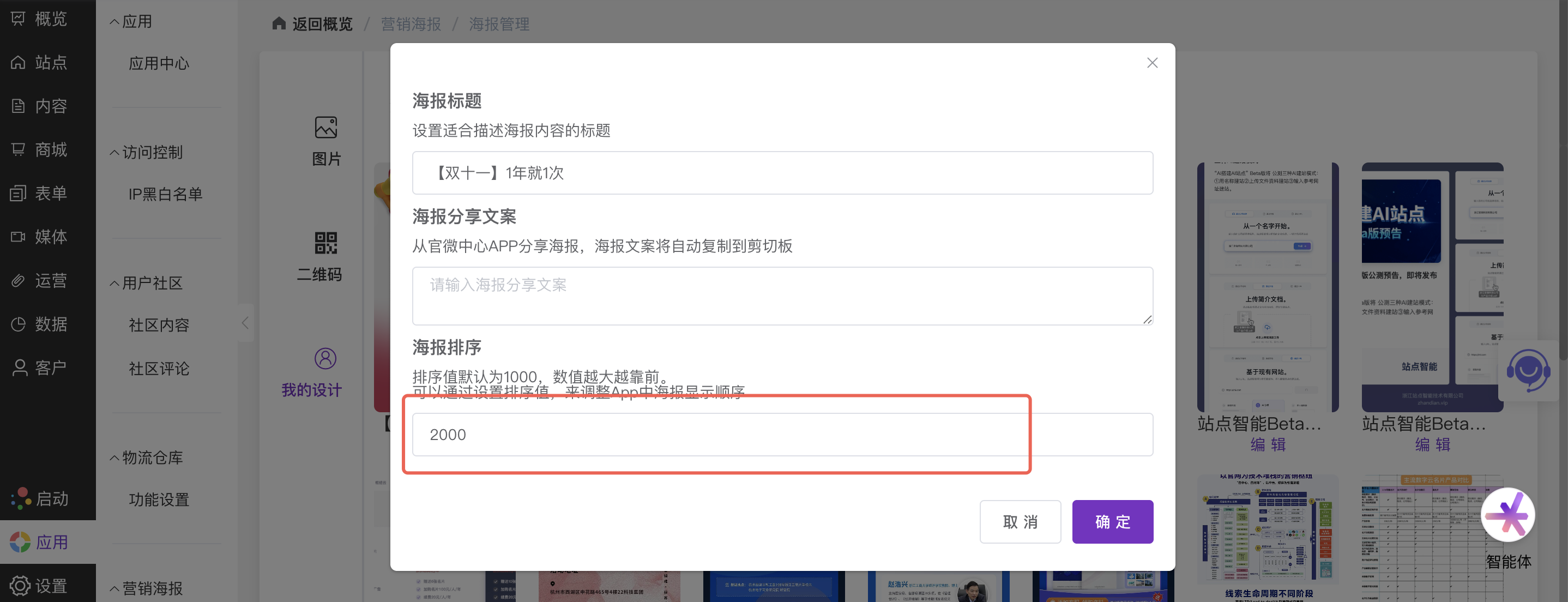 点击该海报下方的 “编辑” 按钮,在弹出的编辑弹窗中找到 “海报排序” 输入框,输入更大的数值(默认排序值为 1000,数值越大越靠前,比如设置为 2000),点击 “确定” 保存,即可让该海报(如早安图)显示在更靠前的位置。