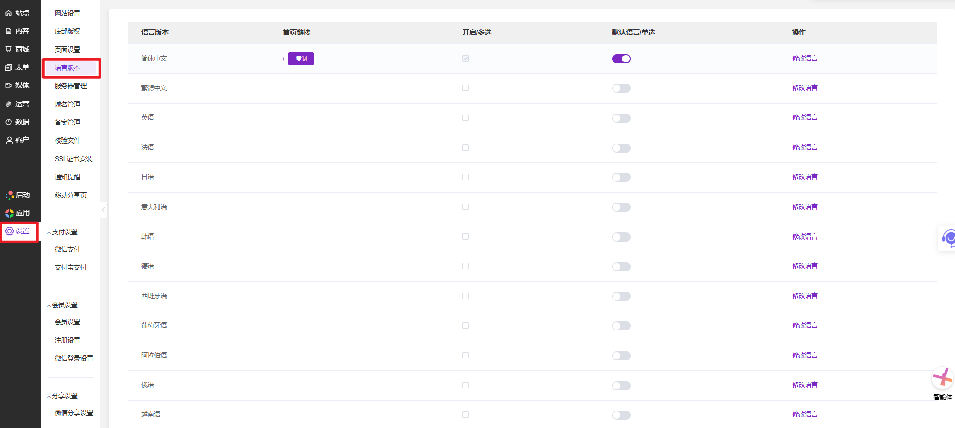 支持。站点智能支持包括中文、英文在内的26种语言的站点内容设置,用户可选择创建单一外语站点(如英文站),或在同一站点内提供多语言版本切换,精准服务不同语言背景的海外受众。同时,平台配备AI自动生成外语内容的能力,发布前还可通过人工校准编辑,保障外语内容的质量和准确性。
