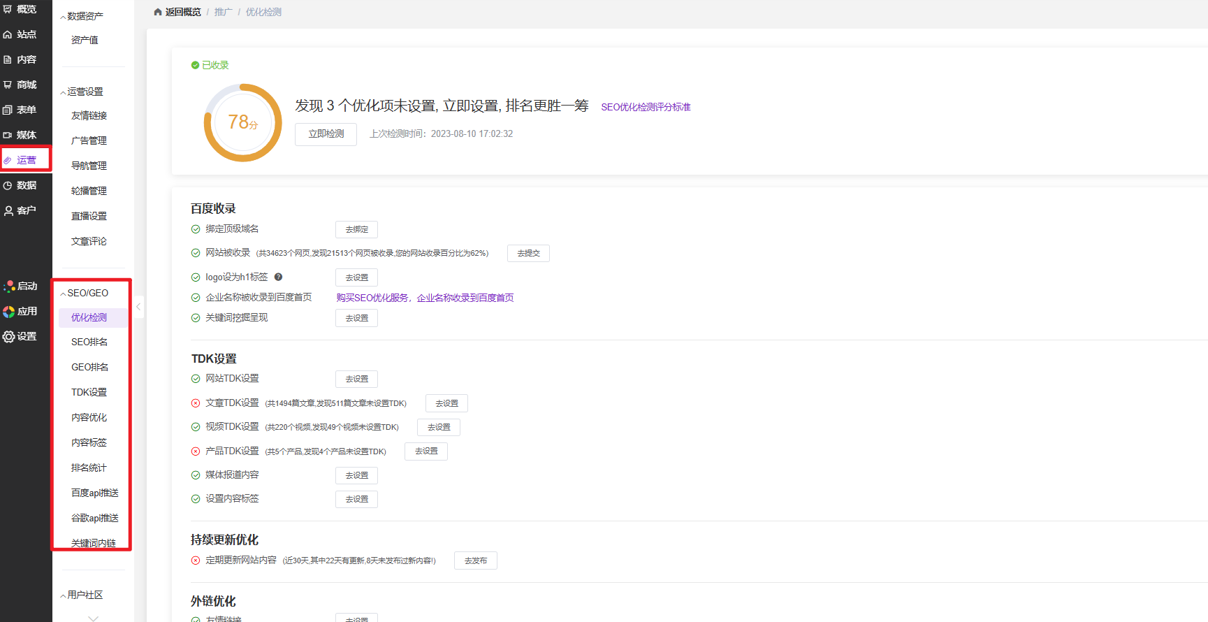 支持。站点智能内置SEO优化工具,为海外流量获取提供保障。提供网站标题/描述/关键词(TDK)的AI智能生成,符合SEO标准;技术上打通百度、微信搜索等国内入口,同时借助多语言支持,使站点内容有机会被Google等全球搜索引擎索引;包含SEO检测与优化的一站式服务,可检查设置并提出改进建议。