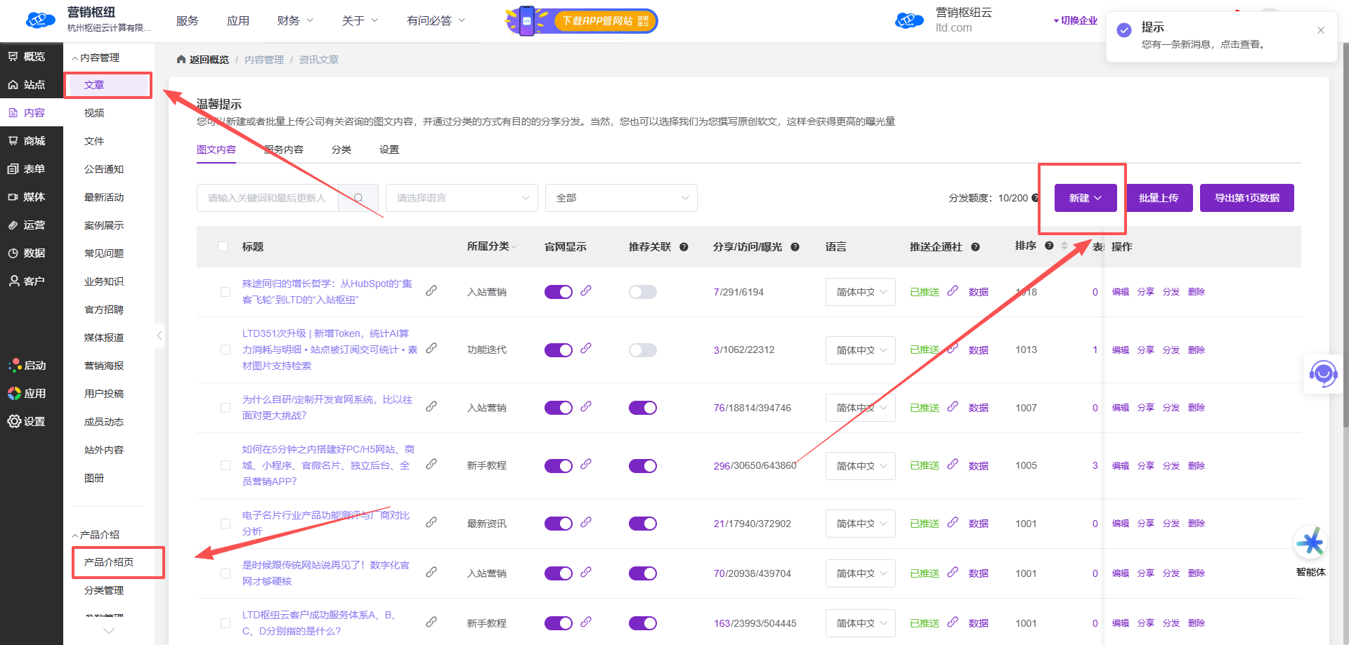 1、登录管理后台,进行内容更新,如需更新文章内容则在侧边菜单内容-文章里进行新建文章: