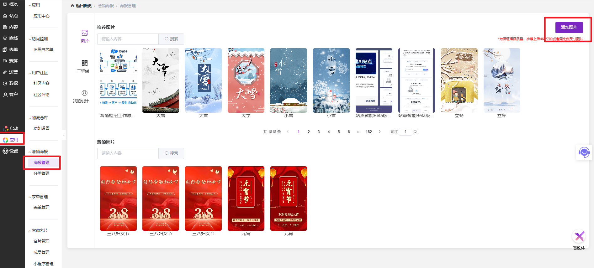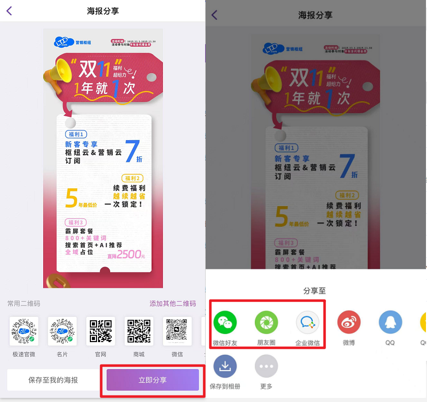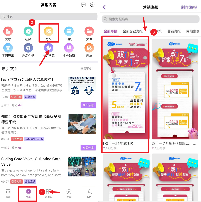 如果选择海报,则进入【分享】—【营销海报】,找到自己上传的海报: