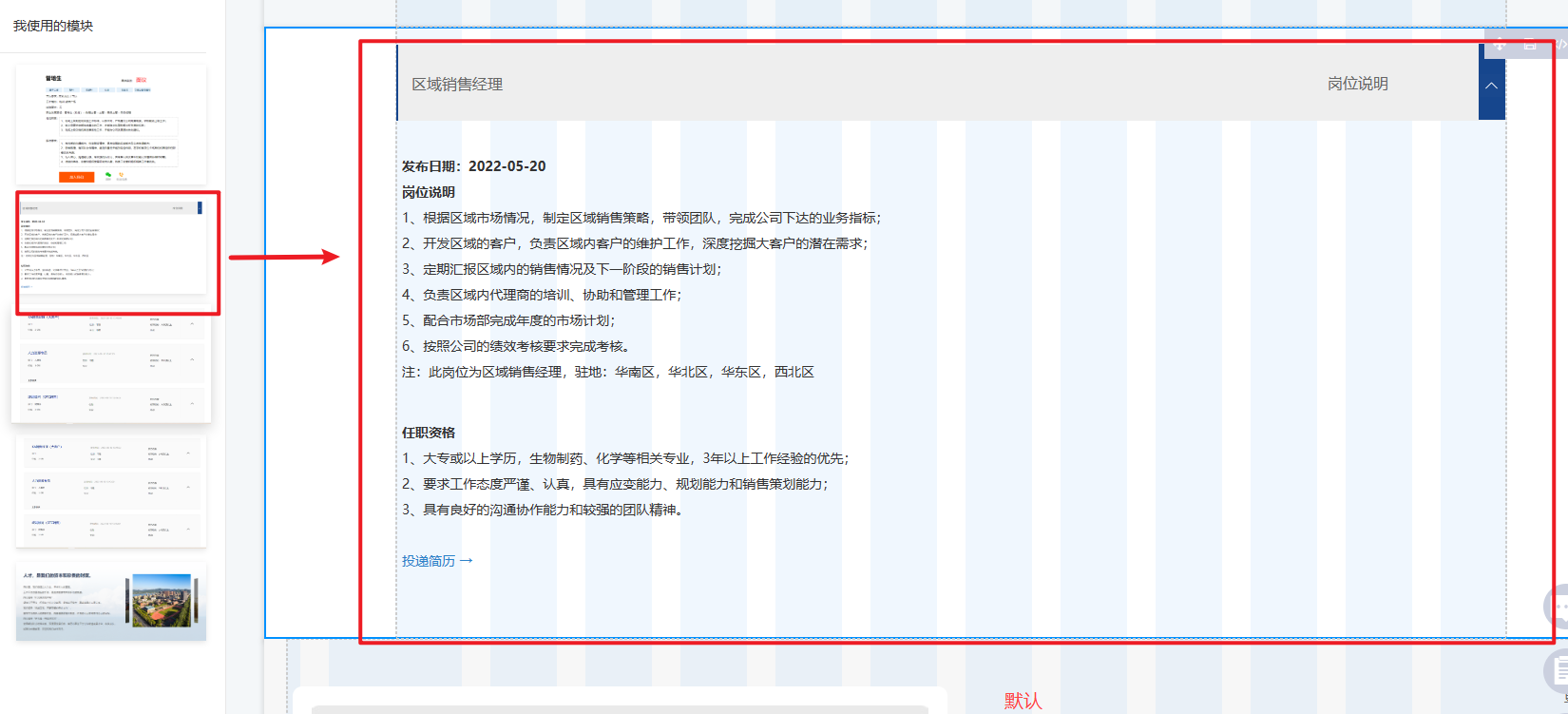 在网站编辑器中,选择【模块】,找到【招聘板块】,选择一个合适的模块,以下面的模块为例: