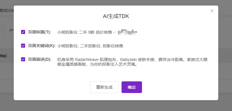 如果只想设置标题、而觉得关键词和描述的生成内容不是很满意,去掉关键词和描述两个信息的复选框的勾选状态,点击确定即可。这样就会只更新页面标题的内容,如果对AI生成的内容不满意,点击下方的重新生成按钮,即可进行重新生成。