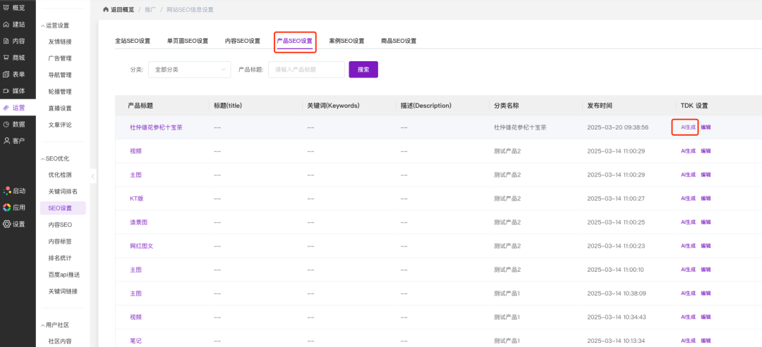 2、给产品生成SEO内容,操作路径:官微中心 - 运营 - SEO设置 - 产品SEO设置