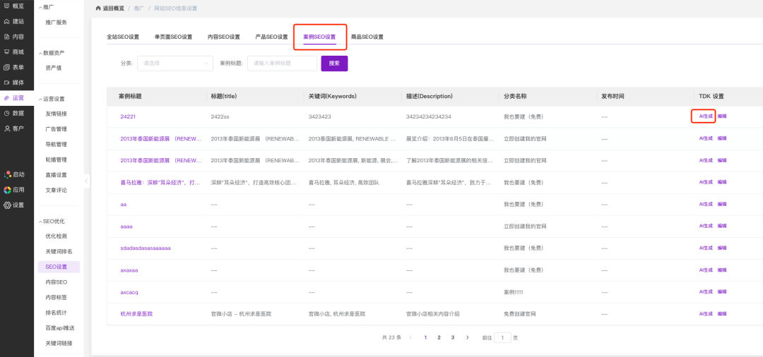 4、给案例生成SEO内容,操作路径:官微中心 - 运营 - SEO设置 - 案例SEO设置: