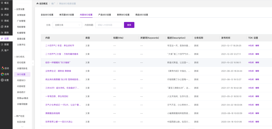 1、给文章生成SEO内容,操作路径:官微中心 - 运营 - SEO设置 - 内容SEO设置: