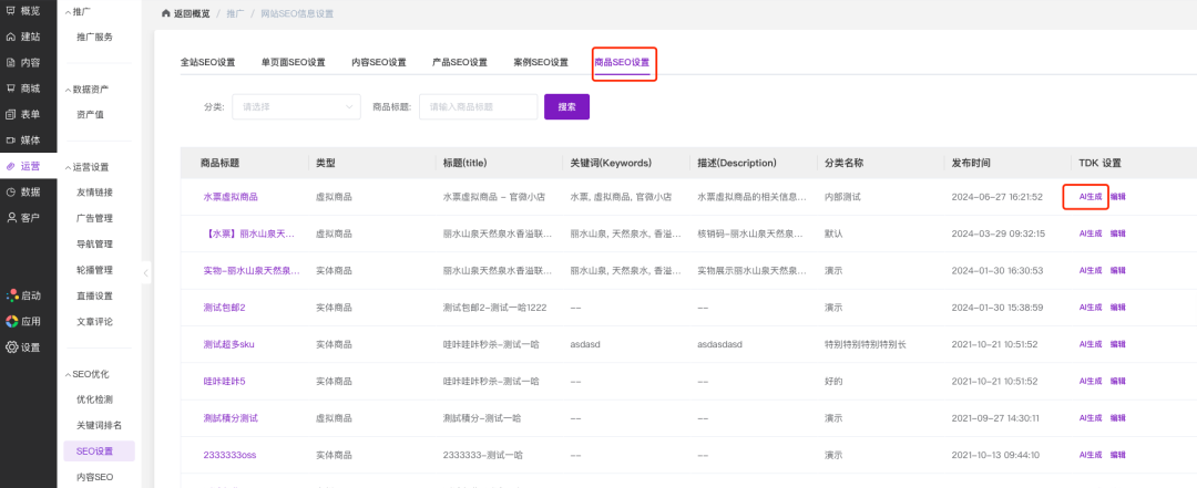该功能可以利用AI来协助生成网页的TDK信,操作路径:官微中心 - 运营 - SEO设置,找到下图中的 AI生成 按钮: