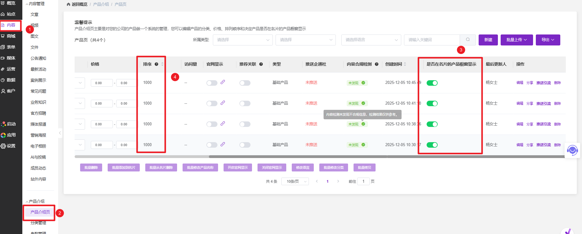 在“内容”下方,点击“产品介绍”,再进入“产品页”,这里可以看到当前系统中所有产品的列表。