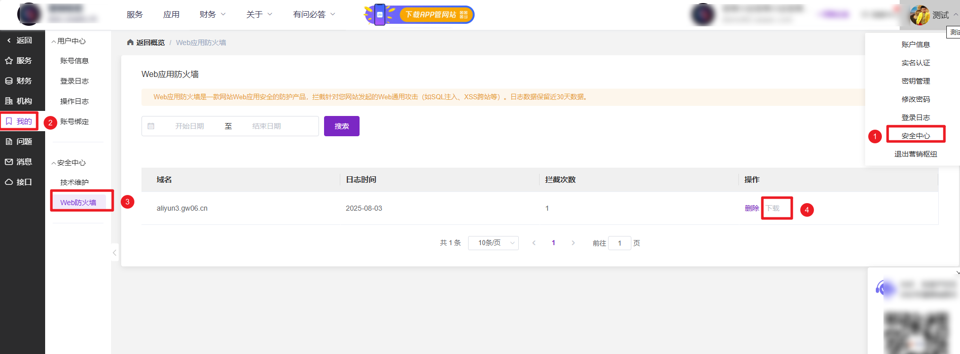在日志条目对应的 “操作” 列中,点击 “下载” 按钮,即可将该 Web 应用防火墙日志下载到本地。