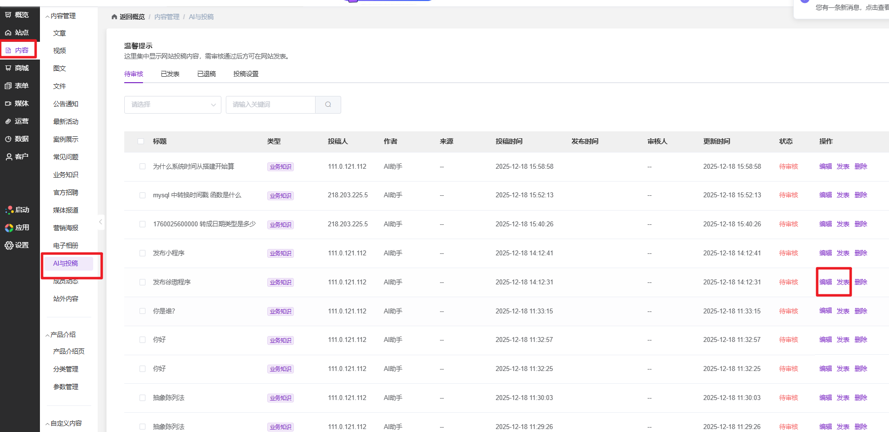 在 AI 与投稿页面中,找到对应预设问题的投稿记录,点击该记录右侧的 “编辑” 按钮。