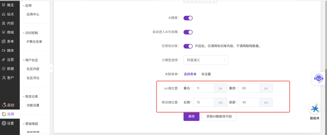 当开启AI智能体功能时,默认在站点右下方会出现悬浮的智能体助手窗口。为了避免部分情况下和页面上其他悬浮元素冲突,本次升级增加了位置设置功能。可以设置距离底部和右侧的距离。为了规范站点里内容的展示与更好地进行站点运营,本次升级我们增加允许开启文章等内容中的作者、来源、分类 等三个字段是否必填的选项。该设置针对 文章、视频、公告通知、常见问题、业务知识、官方招聘、媒体报道等几个类型有效。操作路径:设置 - 站点设置 - 网站设置,找到下图中的 内容必填设置,勾选需要开启必填的字段即可。开启必填选项后,当编辑内容时如果该字段没有填写,会出现如下提示: