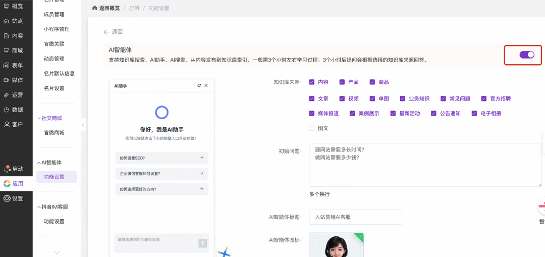 1、AI智能体支持自定义图标位置;2、内容管理增加作者、来源必填设置;3、官微名片优化未登录状态界面、可查看最近访问名片;4、后台增加站点订阅用户查看;5、积分商品兑换优化,支持纯积分兑换;6、其他已知问题修复与优化。