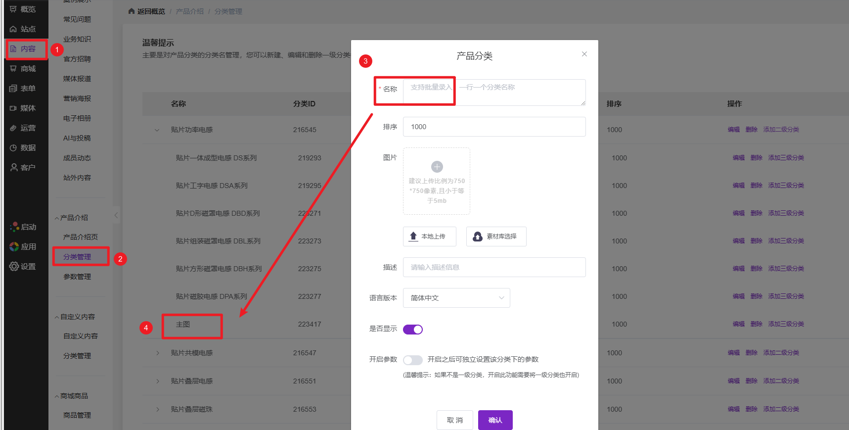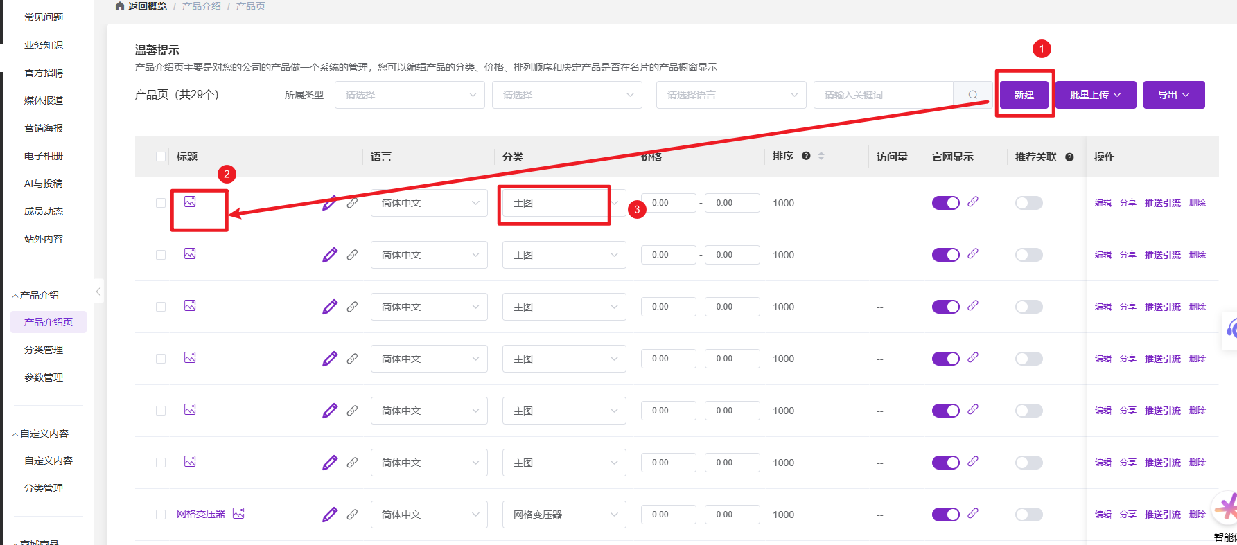 在“产品页”列表页面右上角点击“新建”,在新建产品时把“分类”选择为刚刚创建的二级分类“主图”,并在产品内容里上传你要作为主图展示的图片,然后保存发布。