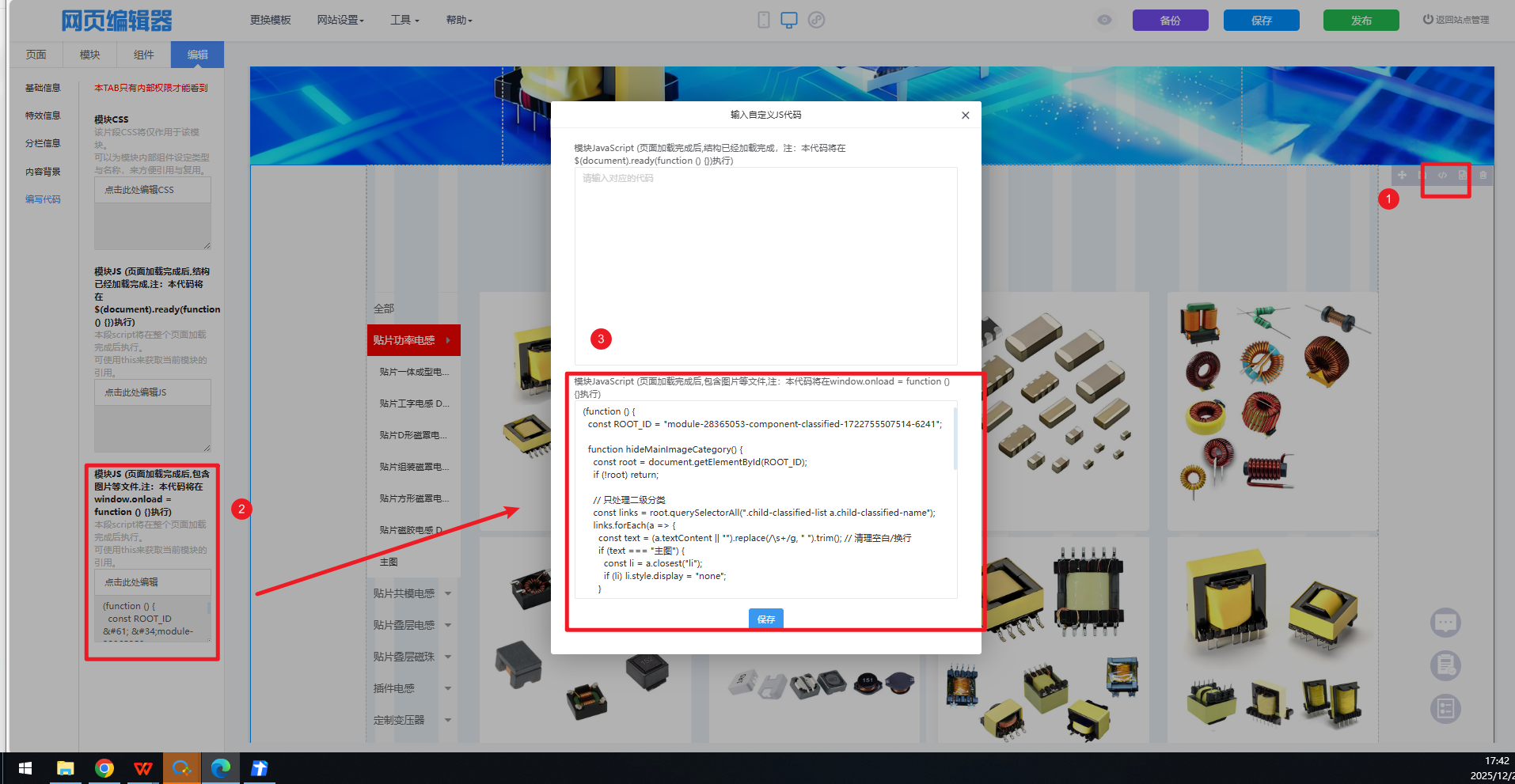 })();完成保存后,点击页面右上角的“保存”,再点击“发布”,让前端生效。