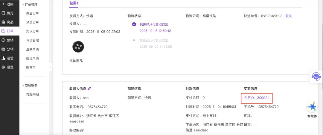 你在处理订单时,常常需要核对下单会员的资料(比如手机号、收货信息是否一致、是否为老客等),但在订单详情里找不到进入会员资料的入口,或者不知道会员ID能不能直接点开查看。现在可以在订单详情的「买家信息」中,通过「会员ID」快捷跳转到会员详情页查看会员信息。
