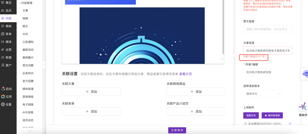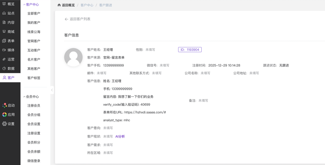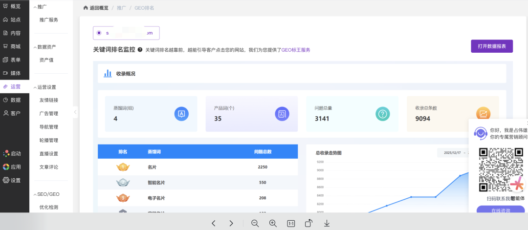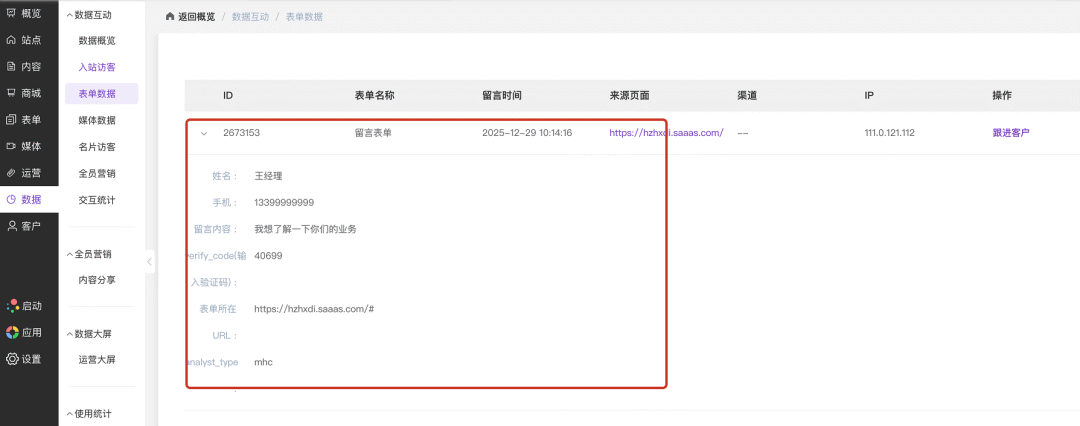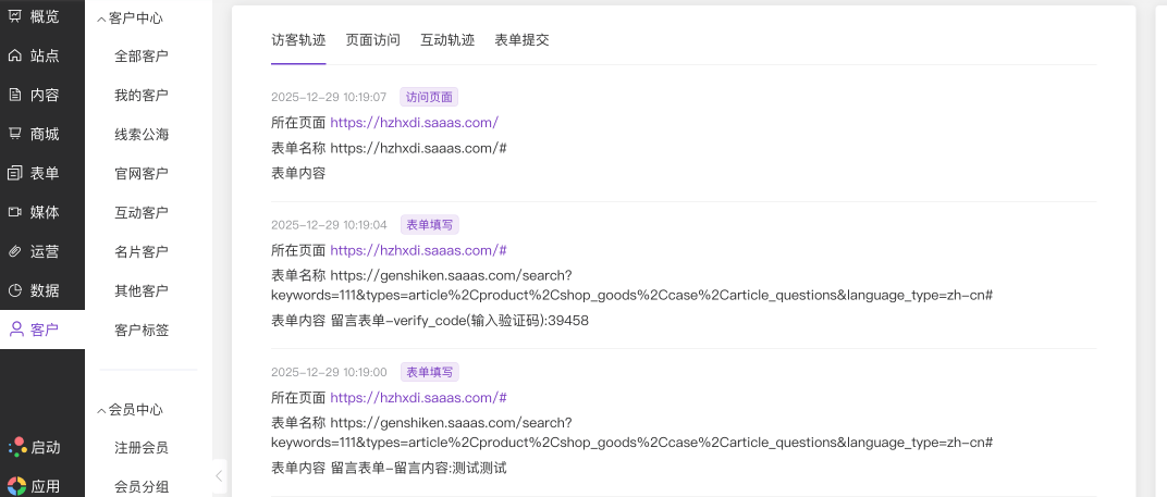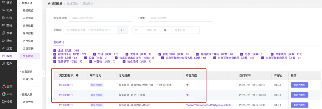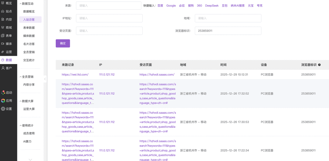 本次升级我们对用于挂载在用户自有网站的访问统计脚本做了大幅度改进,升级后的访问统计脚本,能更好地集成枢纽云的交互统计、CRM等系统功能。统计脚本安装成功后,网站的页面访问记录将会提交到枢纽云系统后台,可以在入站访客中查看到页面的访问情况。可以利用系统后台提供的 PC/手机访问、搜索引擎爬虫、AI爬虫、AI来路等,对网站的访问情况进行评估。在后台首页概览页面,也可以看到不同渠道/设备的每日访问,以图表曲线的方式进行展示。除了页面的访问统计,本脚本也可以获取到用户在页面上进行的一些常见操作以下图中的页面为例,底部导航区域包含了电话、邮箱、QQ客服三个链接,底部包含技术支持的外链:数据可以通过后台的 数据 - 数据互动 - 交互统计 来查看。当用户在页面上点击其中的某一个链接时,这个动作将会统计到系统后台。如下图红框内所示,可以看到同一个用户(相同的浏览器标识),在页面上分别点击了这几个链接。表单是一个网站非常常用的留资手段,但是有一部分用户可能会填写一部分表单字段后、出于种种原因放弃提交。为了避免这些弱意向的线索丢失,本统计脚本也将对表单里的输入框填写、选择框选中等交互动作做了统计,并发送到系统后台。比如下图底部导航中的留资表单,在备注和姓名栏输入了一些内容后(下图红框区域):在交互统计列表内,就能看到这个用户的一些填写行为。可以从上面的列表中看到,除了用户的行为结果外,也能看到这个用户的访问IP地址、IP地域、点击行为发生时的停留时间等信息。本统计脚本也可以将你的网站上的表单留资信息,集中用枢纽云系统进行管理。比如下图页面中的表单,用户点击提交后,一方面可以提交到原有的网站后台,同时也可以自动将填写的表单数据提交到枢纽云系统后台的表单数据中。通过 数据 - 表单数据,可以看到这条提交的表单记录。如果提交的表单记录里包含手机号字段与合法的手机号,将触发枢纽云CRM的自动导入线索功能,将这条留资信息自动导入到线索管理系统里。同时,产生这条线索的用户的访问轨迹,根据对应的用户浏览器标识,将自动汇总相同浏览器标识的访问记录和交互动作,显示在客户详情下方。目前可以通过 数据 - 入站访客 找到右上角的 获取统计代码点击弹出窗口内的‘复制代码’,即可将相关代码复制到剪贴板将这段代码设置到自有网站的head区域,即可完成安装。这个步骤需要安装自有网站的实际后台管理系统来进行设置。购买GEO服务用户,可以通过后台 运营 - SEO/GEO - GEO排名 来查看GEO的数据报表。服务中的客户,GEO报表将自动更新。点击下图右上角的"打开数据报表"按钮,即可打开报表页面,查看最新的数据。为了规范站点里内容的展示与更好地进行站点运营,对来源与作者做了限制12个字处理。05