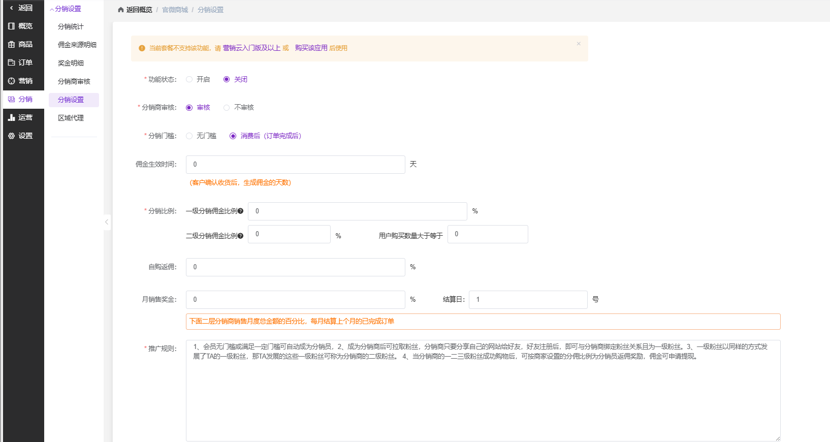 点击在线商城中的“分销”功能,就可以在这个界面中设置分销的详细规则制度。