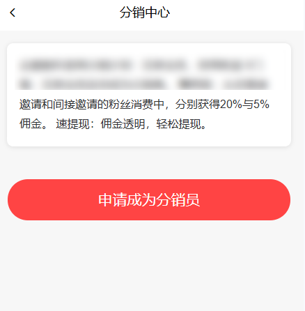 在分销中心页面中,点击页面中的「申请成为分销员」按钮,按照页面提示完成申请操作,申请通过并成功成为分销员后,返回官微商城商品列表或商品详情页面。