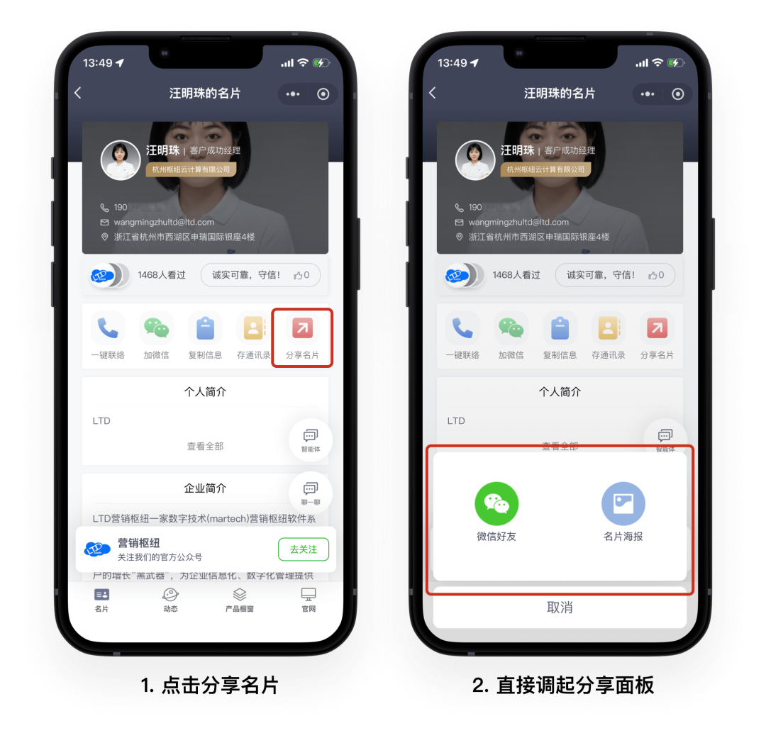 在弹出的分享面板中选择「微信好友」进行分享,或选择「名片海报」查看分享海报。