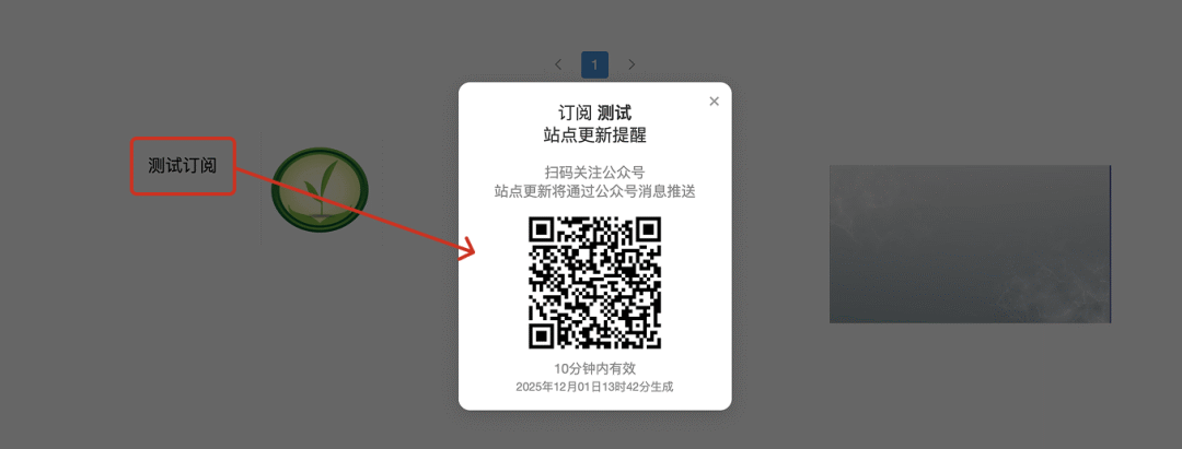 在弹出的订阅二维码窗口中,用户可通过扫码关注公众号,完成本站点的订阅流程。