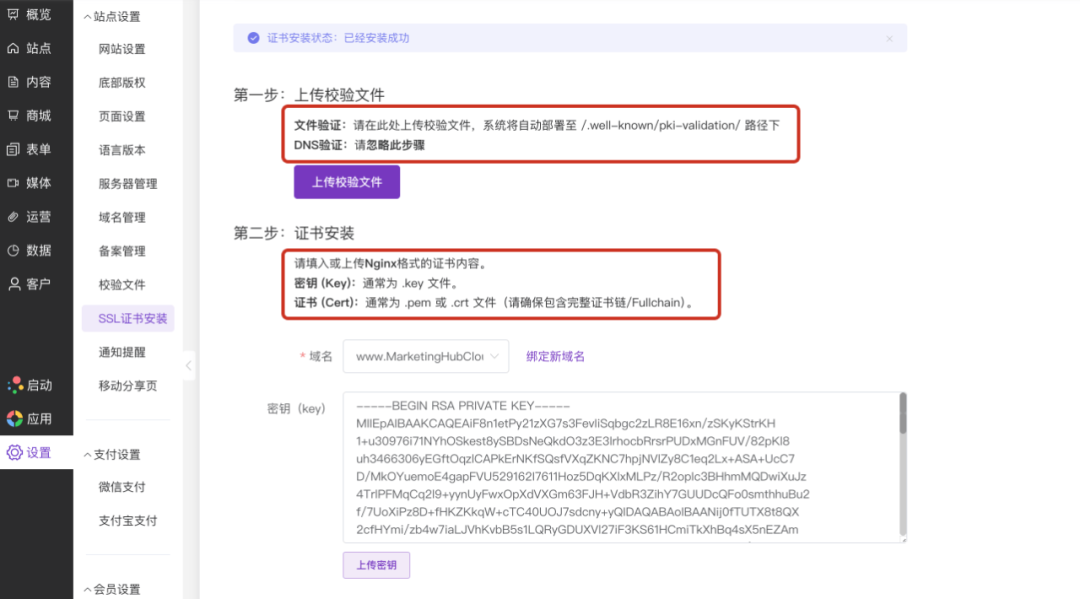 在站点后台进入操作路径:设置—站点设置—域名管理—SSL 证书安装,可以看到证书安装被拆分为“第一步:上传校验文件”和“第二步:证书安装”两个步骤。每个步骤下方都会有对应的操作说明,用来提示文件上传后的路径和填写方式。