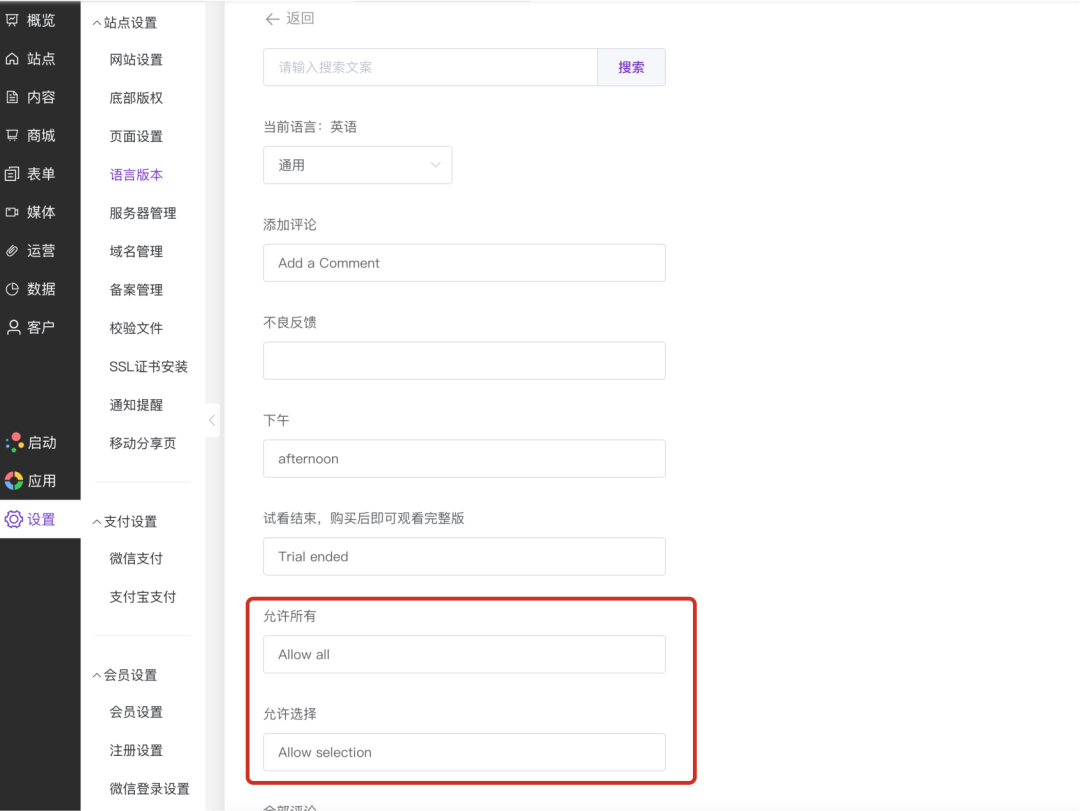 如果站点还启用了「允许选择」按钮,可以在同一位置找到「允许选择」字段,按相同方式为不同语言设置对应的按钮文案。