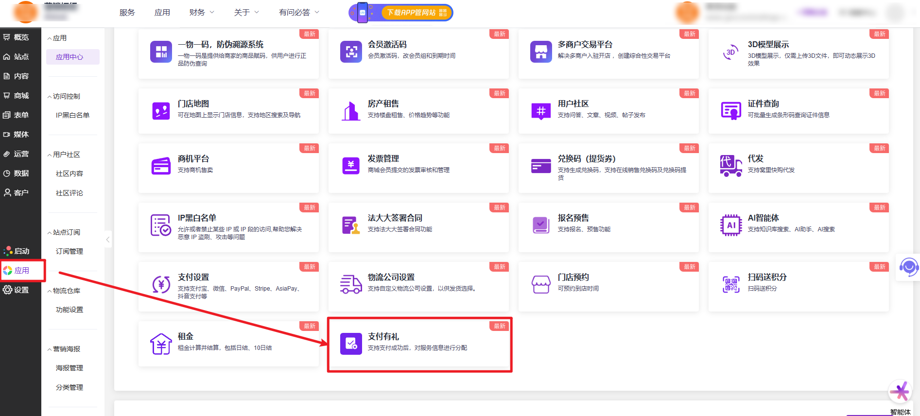 操作路径:应用—支付有礼。