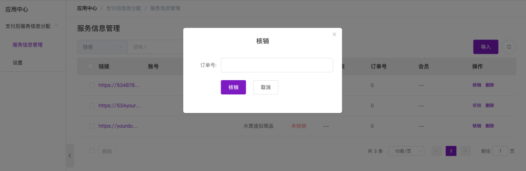 在链接管理列表中,每一条记录都对应一份可发放的服务信息,系统会在用户支付成功后,从未使用的记录中自动分配一条,并与订单进行关联。
