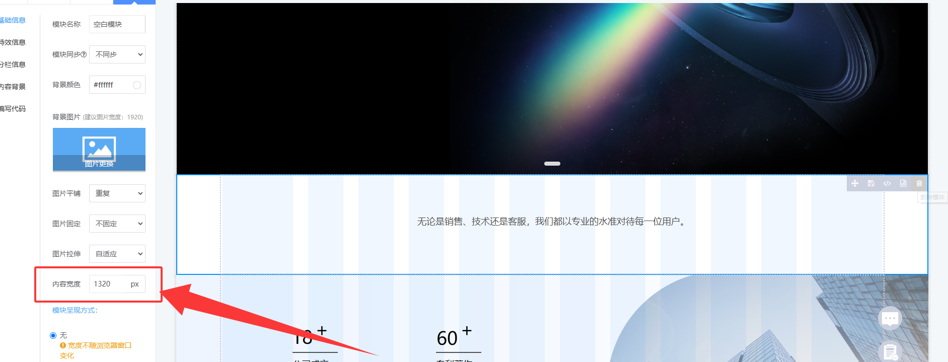 将「内容宽度」的数值调整为和原模板模块相同的宽度,例如原模块使用的是 1320px,这里也输入 1320px,即可让新增空白模块的实际显示宽度与原模块保持一致。