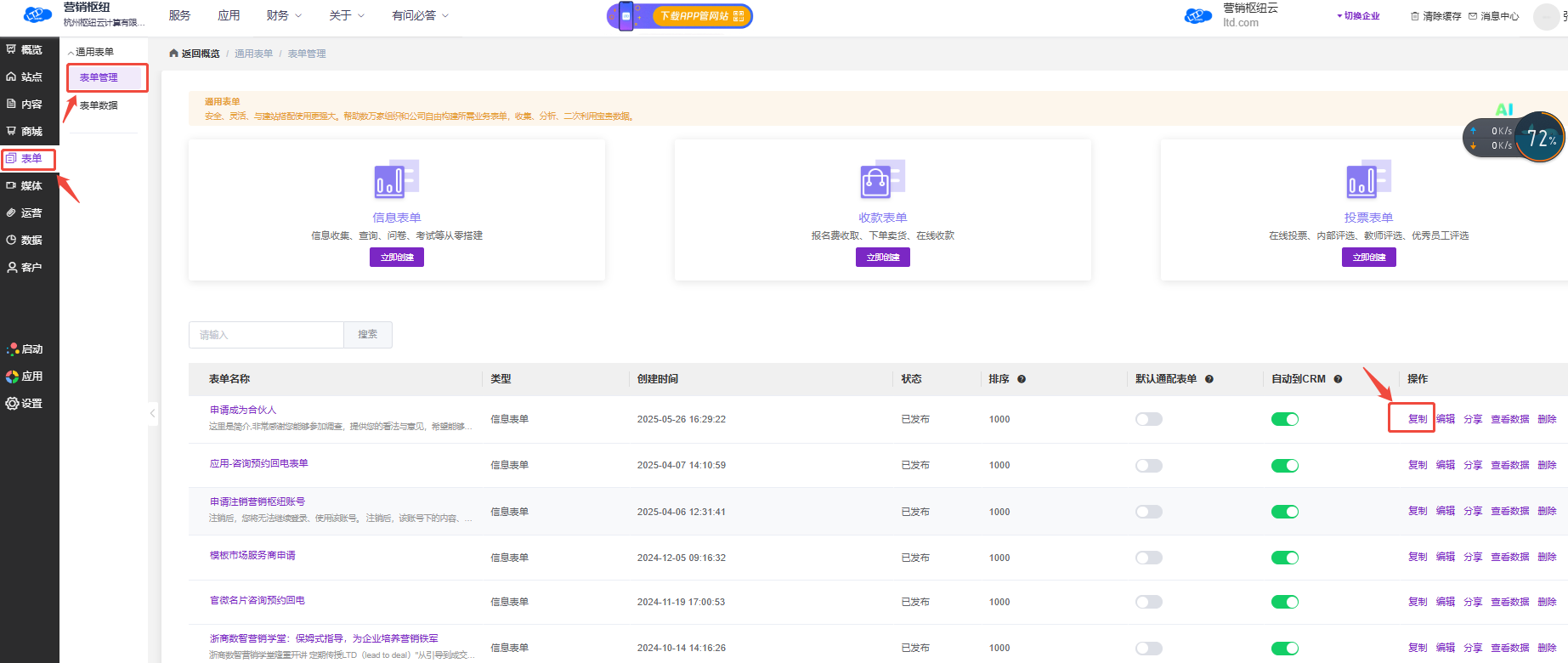操作路径:表单 - 表单管理,找到下图红框内的"复制"按钮,点击即可完成表单复制。