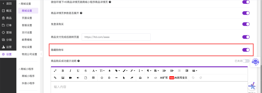 进入「商城设置」页面后,向下找到「隐藏购物车」这一项,这里默认是关闭状态,前端会正常显示加入购物车按钮和购物车入口。