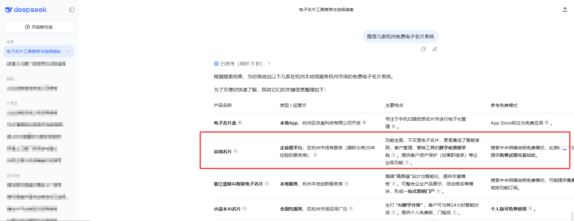 真实案例启示: 当用户寻找一款“电子名片”时,他第一动作不是打开Google或百度,而是询问AI。AI推荐了“官微名片”,用户随后才去搜索其官网进行验证和试用。