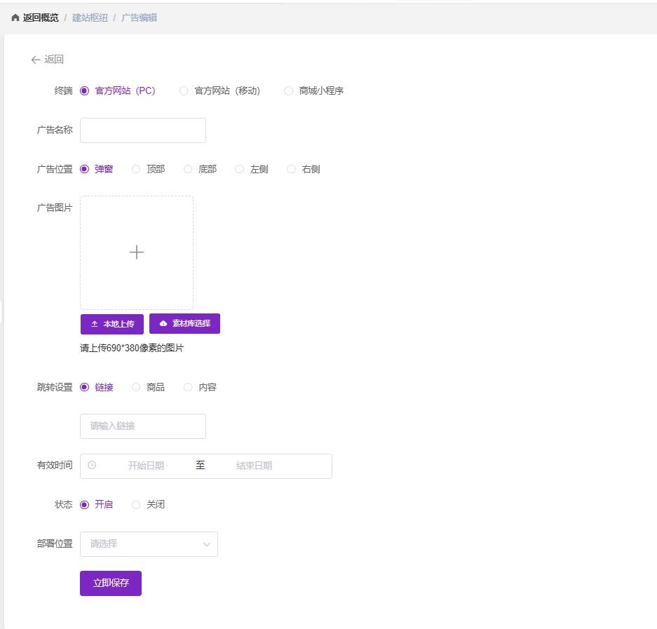 最后确认「状态」为开启,在「部署位置」中选择网站首页对应的位置,点击页面下方的「立即保存」,保存成功后,用户在有效期内打开网站首页时,就会看到该图片弹窗广告。