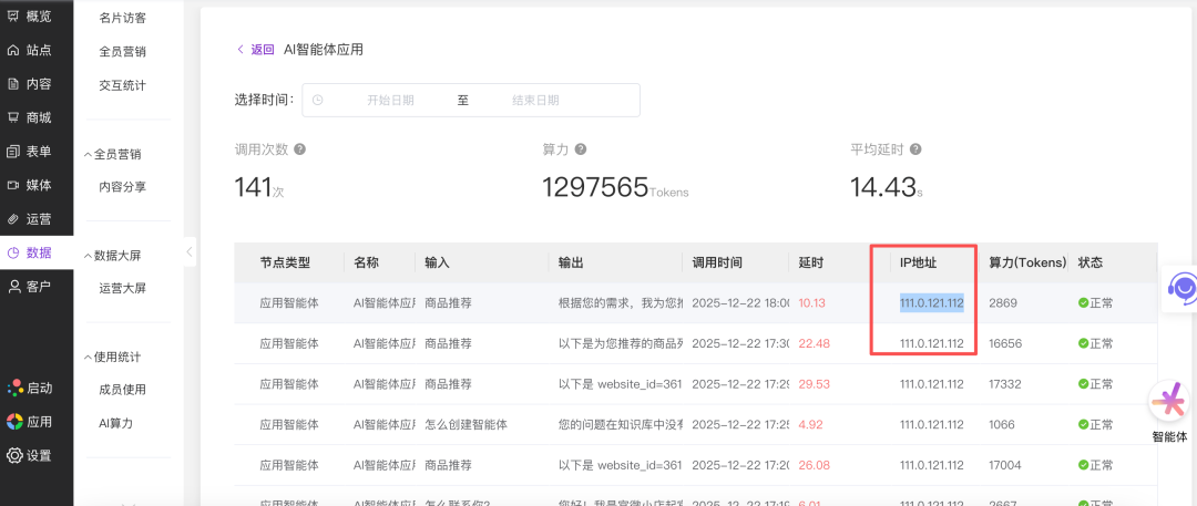 在打开的 AI 算力统计详情页面中,上方展示了调用总次数、消耗总算力以及平均延时等汇总数据。在页面下方的调用明细表格中,您可以找到新增的 IP 地址列,这里会详细展示每一条 AI 智能体调用记录对应的网络 IP。