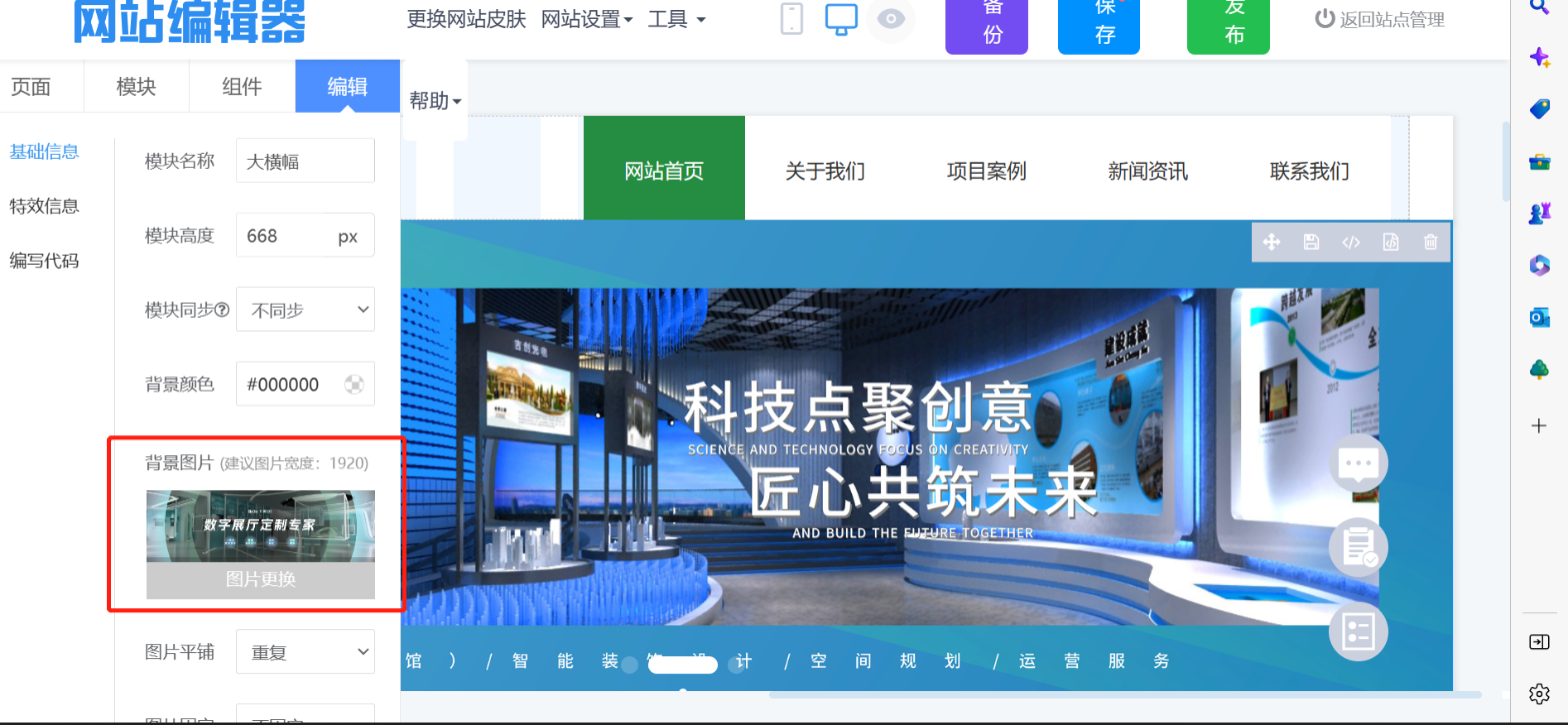 如果您修改的是单张背景形式的大横幅,请在左侧面板的“编辑”菜单下选择“基础信息”,在“背景图片”功能区点击图片下方的“图片更换”按钮上传新图。