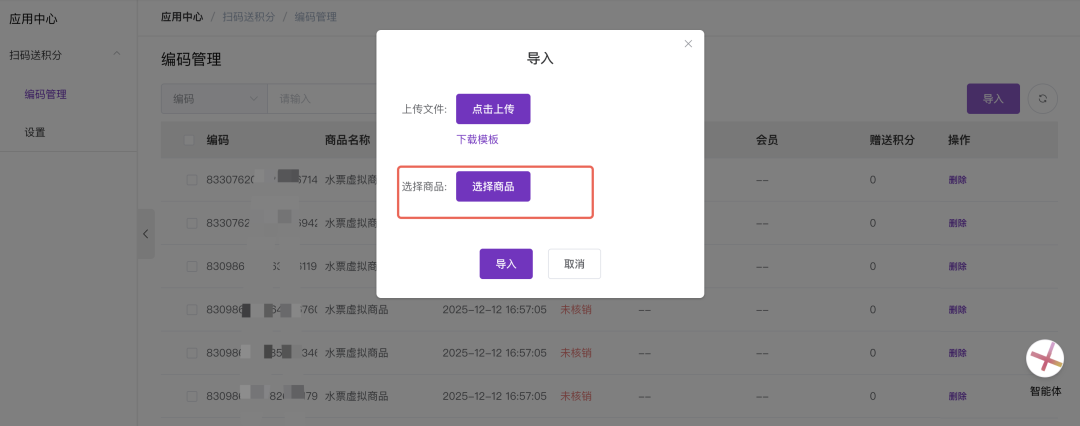 接下来点击左侧的“编码管理”菜单,点击页面右上角的“导入”按钮来关联条码数据。在导入弹窗中,点击“选择商品”按钮,确保您上传的这一批条码编码与刚才设置了特定积分的商品准确对应,然后完成导入操作。