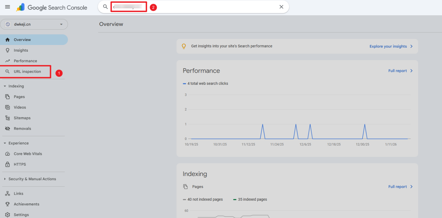 首先进入 GSC 后台,在页面顶部的搜索框中直接输入您想要检查的完整网页链接,或者在左侧导航栏中点击进入 URL inspection 页面后再行输入。